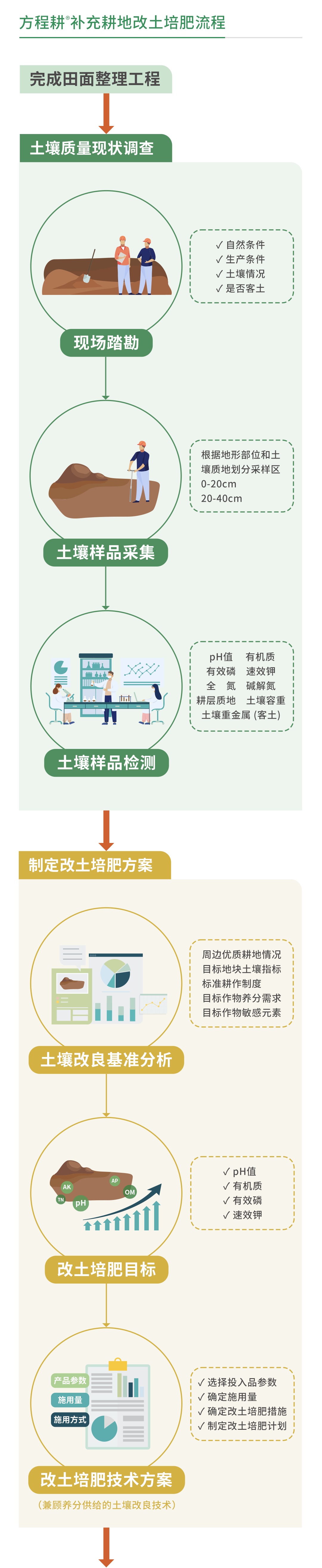 方程耕®丘陵山地补充耕地改土培肥解决方案:针对补充耕地不同土壤类型及存在问题精准施策,提供「土壤调查评估→改土培肥技术方案→投入品研发生产→治理管护→效果核验」全链条一站式解决方案,保障作物最佳生长环境、提高土壤质量评价指数、快速提升补充耕地质量等级。